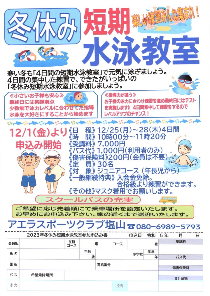 アエラスポーツクラブ塩山からのお知らせです。本年の「冬休み短期水泳教室」の詳細が、決定!友達に追い付きたい子、追い越したい子、もっと上手になりたい子は、ぜひ…
