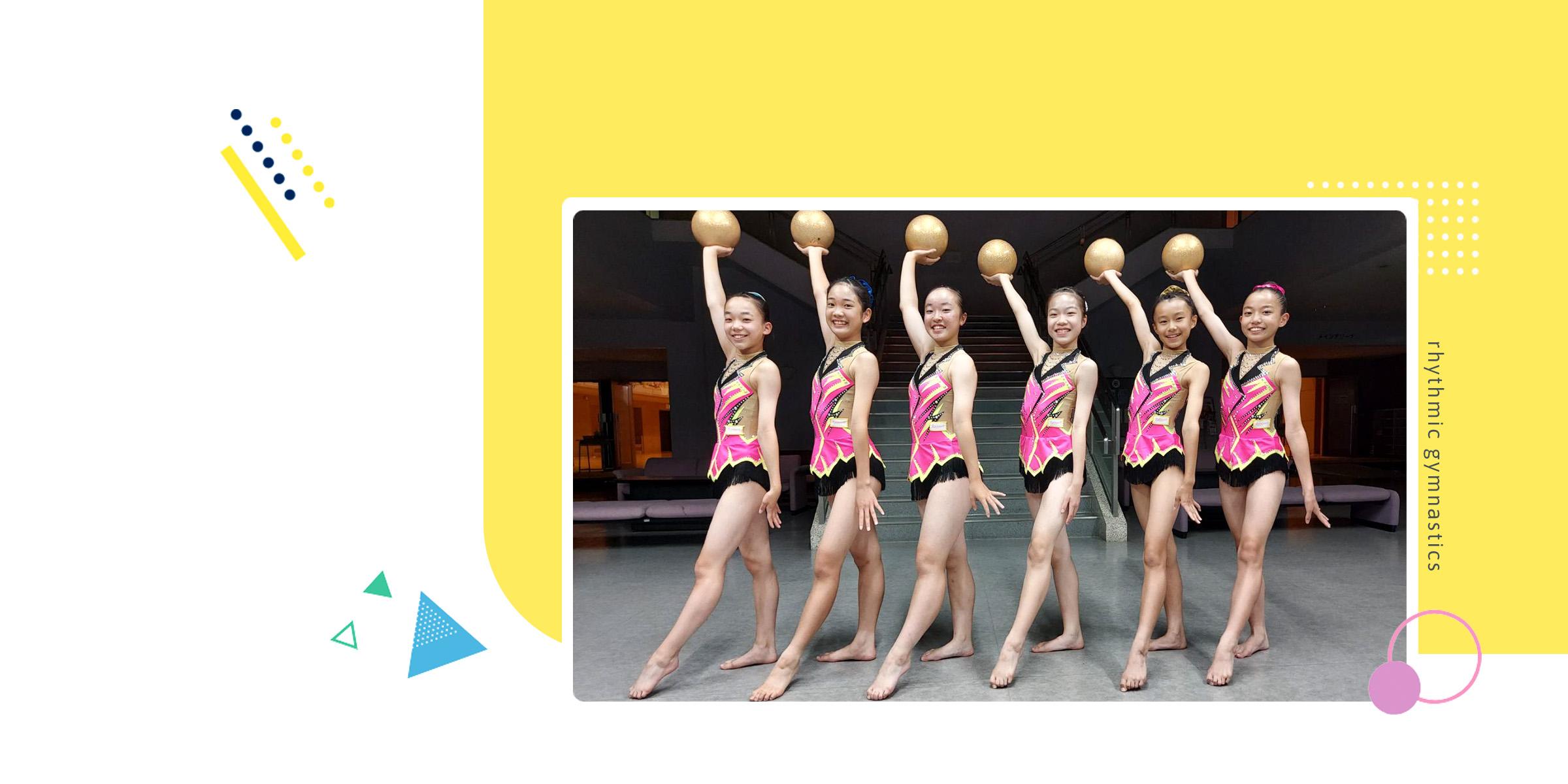 リボン・ボール・クラブ・フープ・ロープの5種類の手具を使いながら、音楽に合わせてリズミカルな演技を行い、柔軟性・リズム感・表現力・協調性・基礎体力などを身につけるスポーツです。